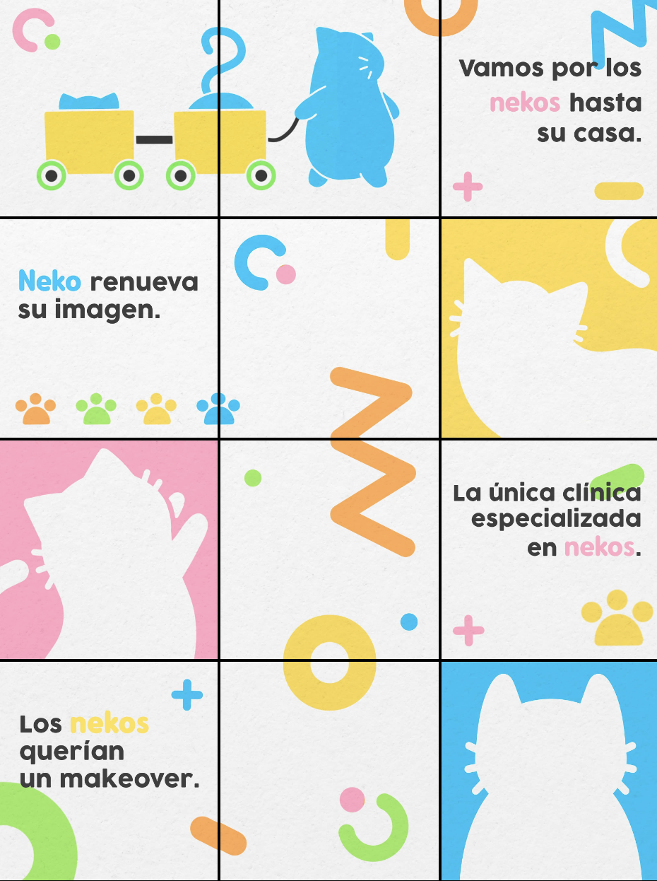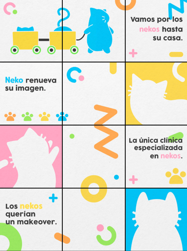 Se trabajó en un rediseño de la identidad gráfica de NEKO Clínica manteniendo su logo anterior intacto. La mejor decisión fue apuntar a una variedad de colores pasteles con ilustraciones de gatos y elementos que sumen a un aspecto más amable y divertido.